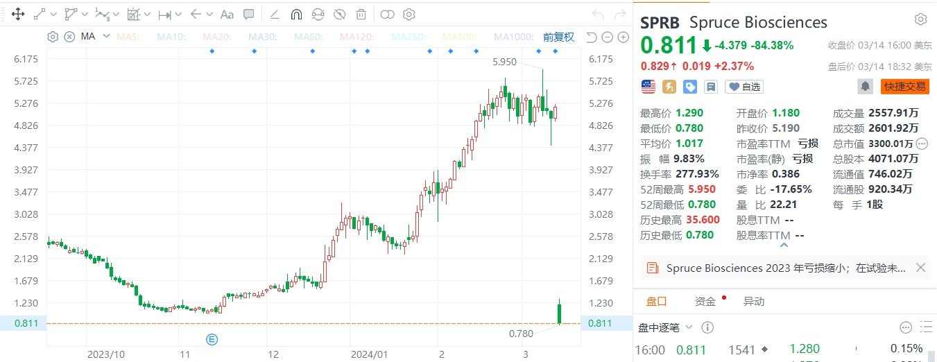 生物制药公司Spruce Biosciences Inc.(SPRB.US)收跌超84%,报0.811美元,总市值3300万美元。消息上,近日该公司宣布,针对先天性肾上腺增生症的Cahmelia-203研究结果未能达到主要终点。