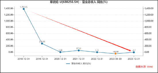 然而,寒武纪业绩却出现下滑。2023年业绩快报显示,公司2023年实现营业收入7.09亿元,同比下降2.7%;归属于母公司所有者的净利润-8.36亿元,上年同期为-12.57亿元。值得注意的是,公司近年业绩增速持续疲软,具体如下: