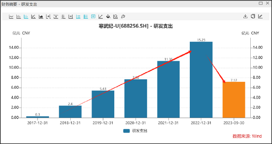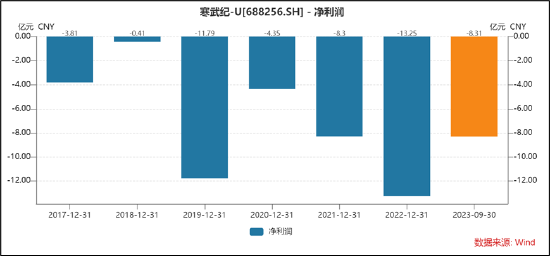 Wind数据显示,寒武纪自2020年上市以来,仍然处于持续亏损中,现金分红为0。